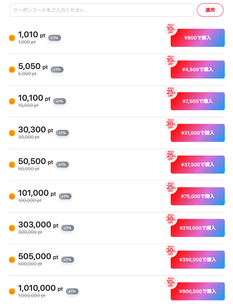 金額の後についている「+1%」というのは「ポイント購入時のボーナス率」でシルバーランクは+1%になっています。10,000pt購入で10,100ptとなります(ブラックだと「+5%」なので10,500ptとなります)。