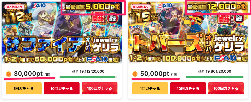 これは、時期によって違うのですが現在は、一口14,000ptで最低保証15,000ptのPSA10が確実に手に入る「アド確定ポケクロデビューオリパ」が提供されています(2025年7月現在)