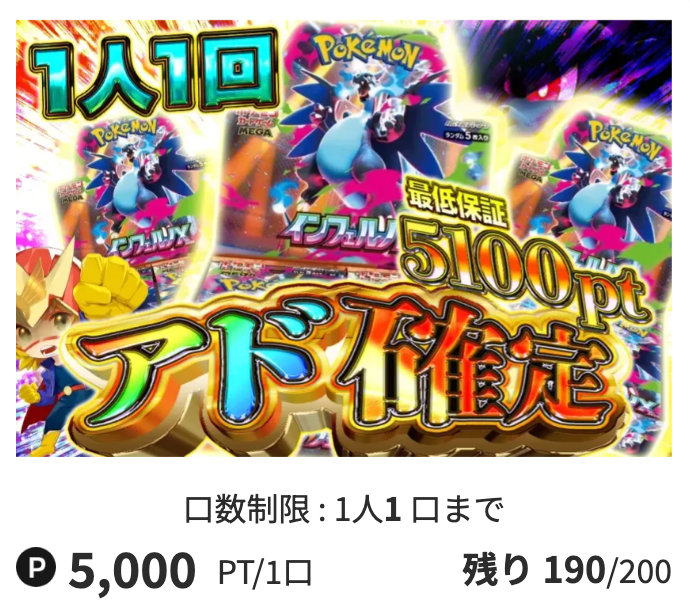 今日も1人1回アド確定(一口5000pt/200口)に挑戦できました。