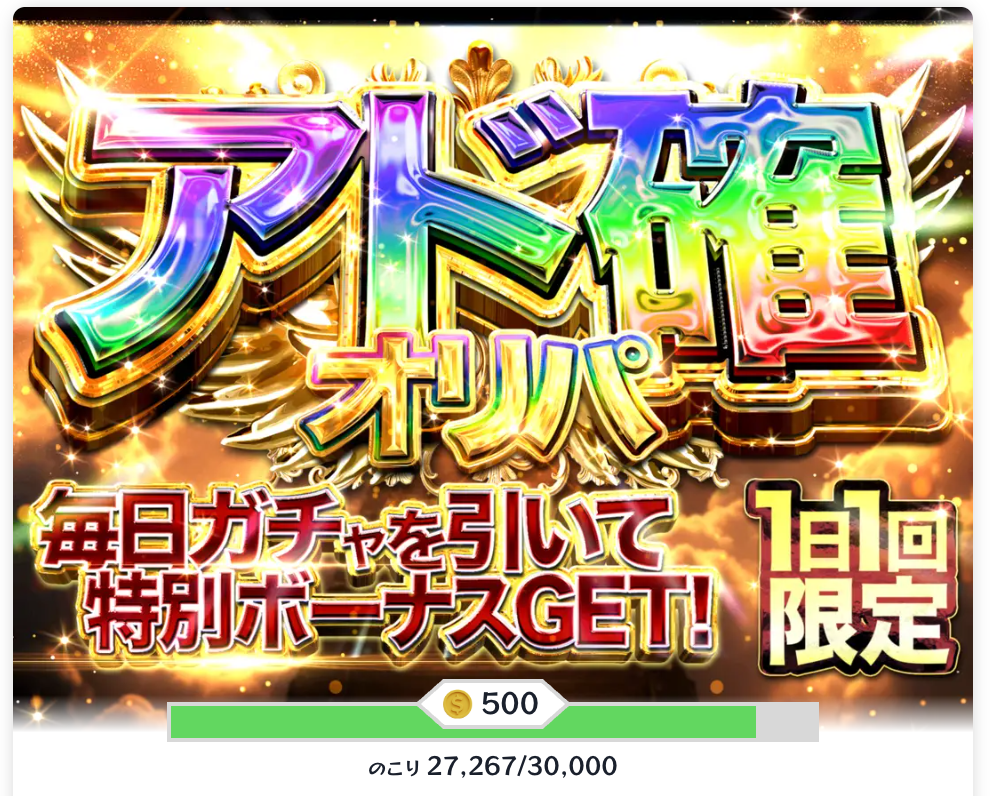 今度は、激アツ!!!!ゲリラアド確定ガチャ!!が登場したので更に500ptをチャージして挑戦権をGET。