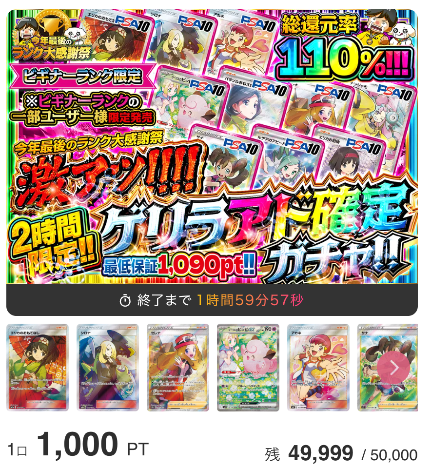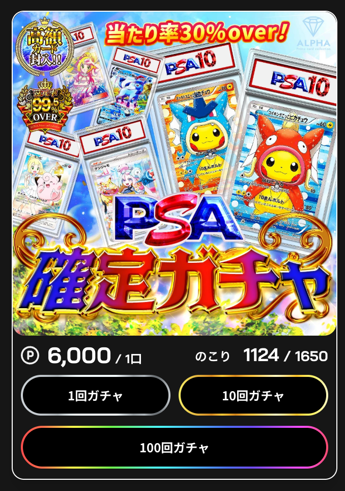 Card Shop ALPHA(アルファ)は、ログボで6000ptが貯まったので再び「PSA確定ガチャ」に挑戦。