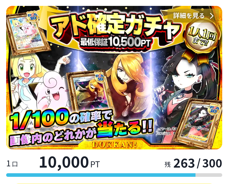 次は、1/10の確率でPSA10確定!!(一口850pt)の10連を1回引きます。これも当たるよね。