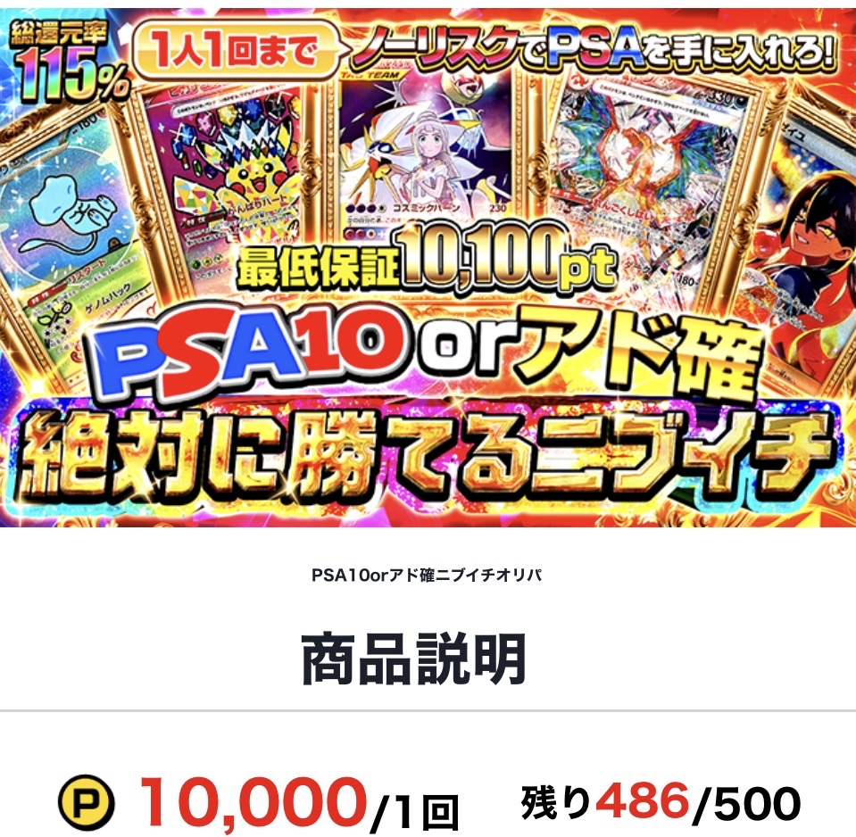 0時になると「PSA10orアド確 絶対に勝てるニブイチ(一口10,000pt/500口)」が解放されました。