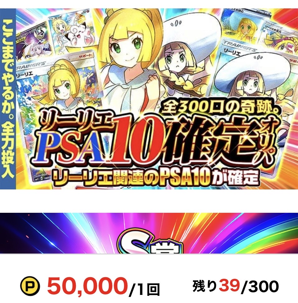 そして、ついに「リーリエPSA10確定オリパ(一口50000pt/300口)」に挑戦!